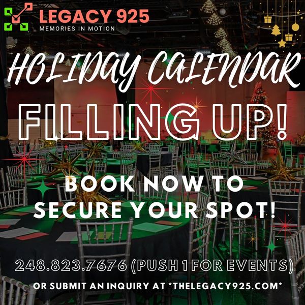✨ The holidays are right around the corner — and our calendar is filling fast! From corporate parties to family celebrations, Legacy 925 is the place to make your memories in motion. 🎁